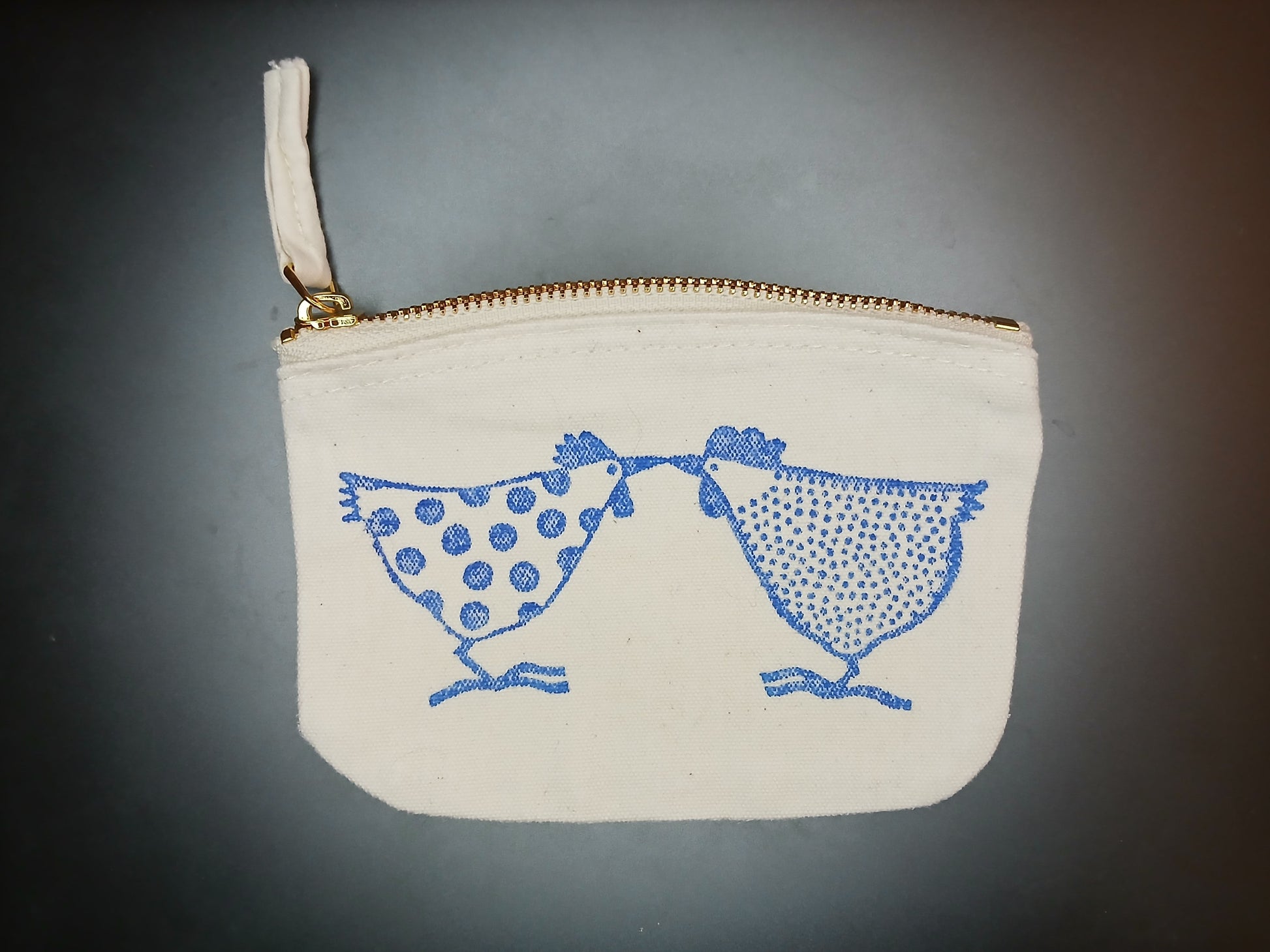 Chickens in blue on natural cotton purse