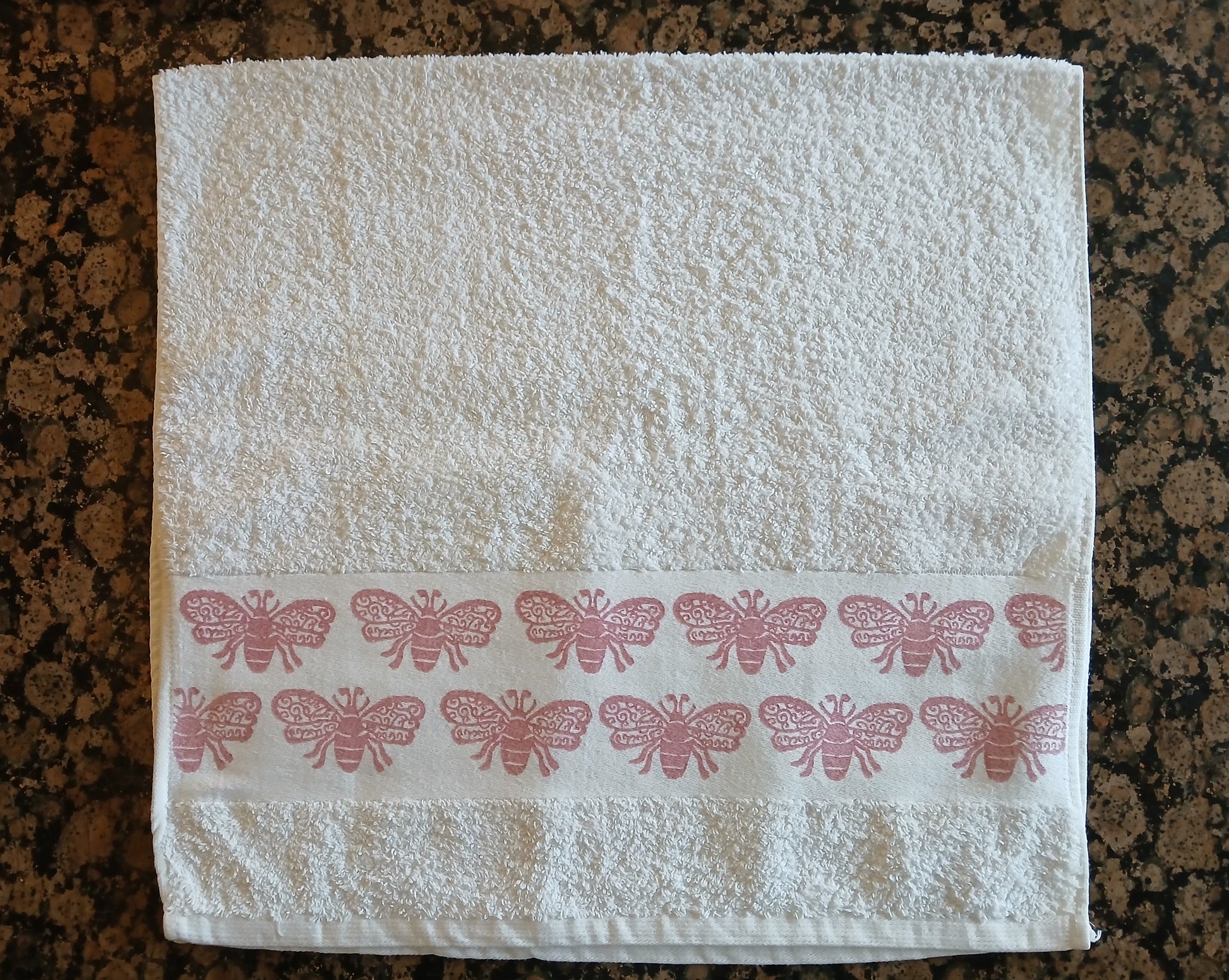 Hand towel, approximately 50cm x 100cm, 100% cotton with printed flat weave border.