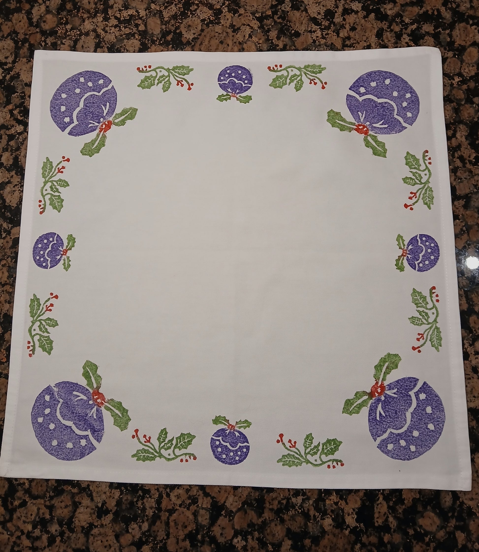 Christmas Pudding & Holly on white cotton napkin