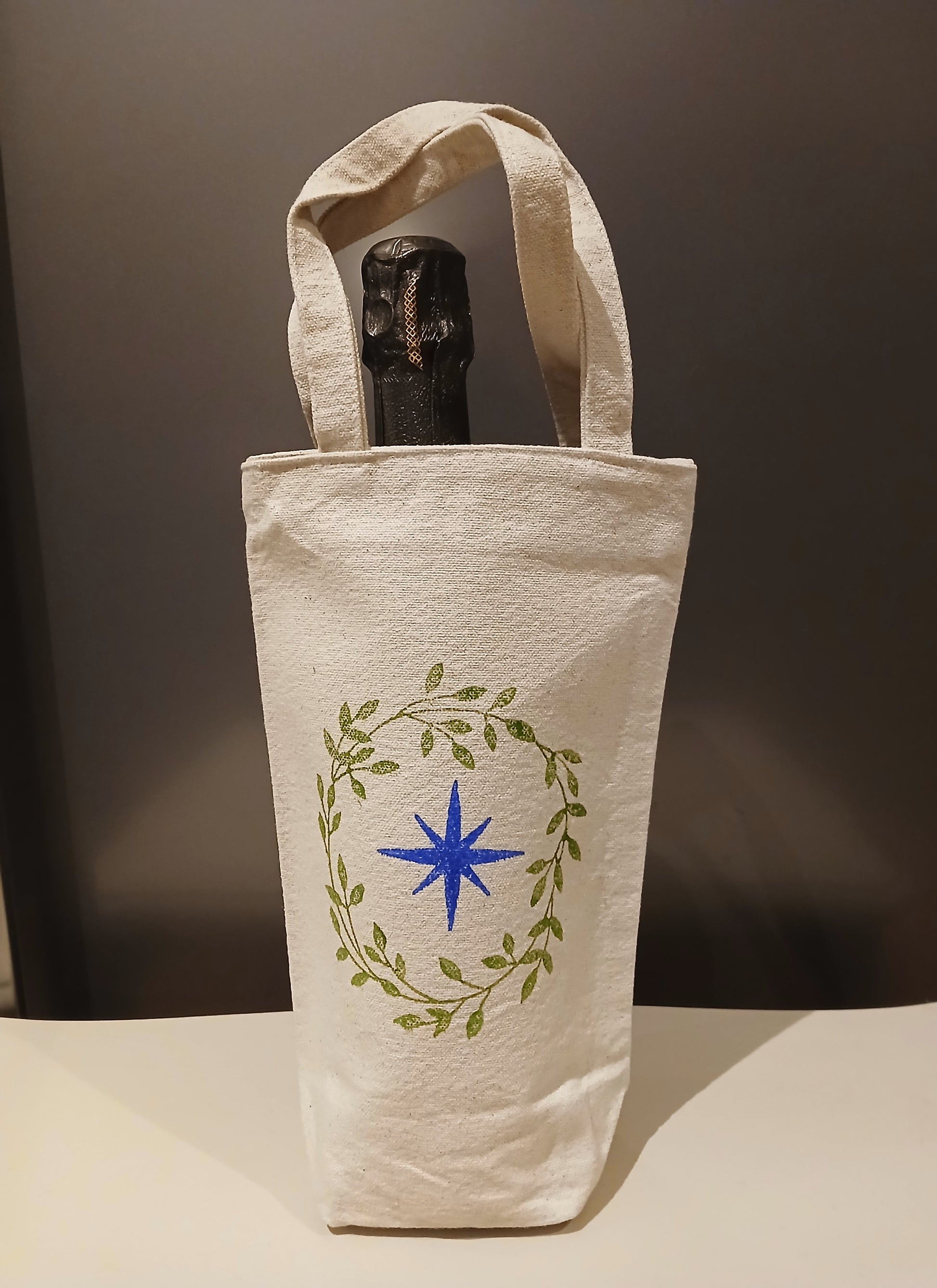 Wreath & Christmas Star in green & blue on natural cotton canvas bottle bag