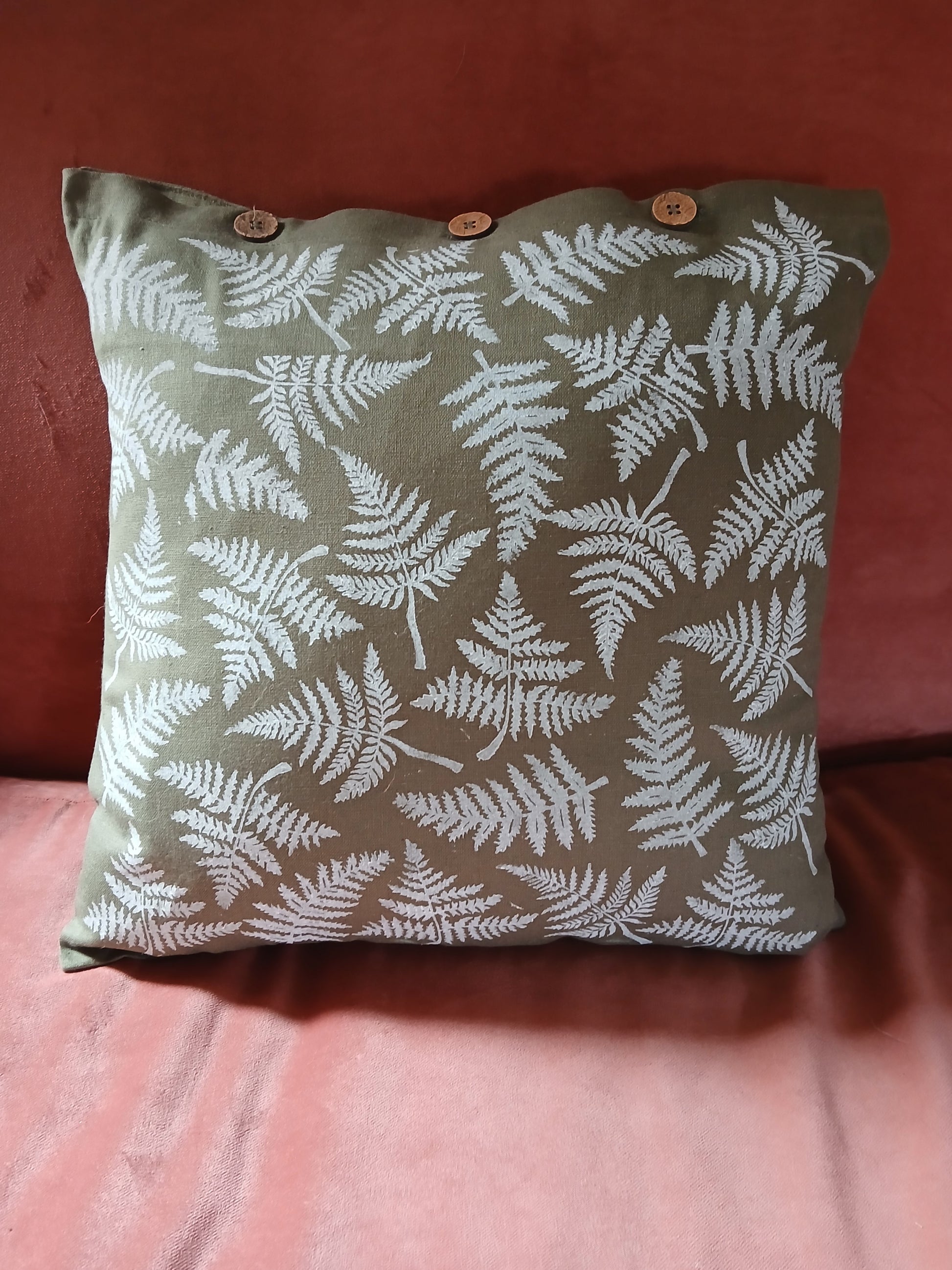 Ferns in White on olive green cushion cover with buttons
